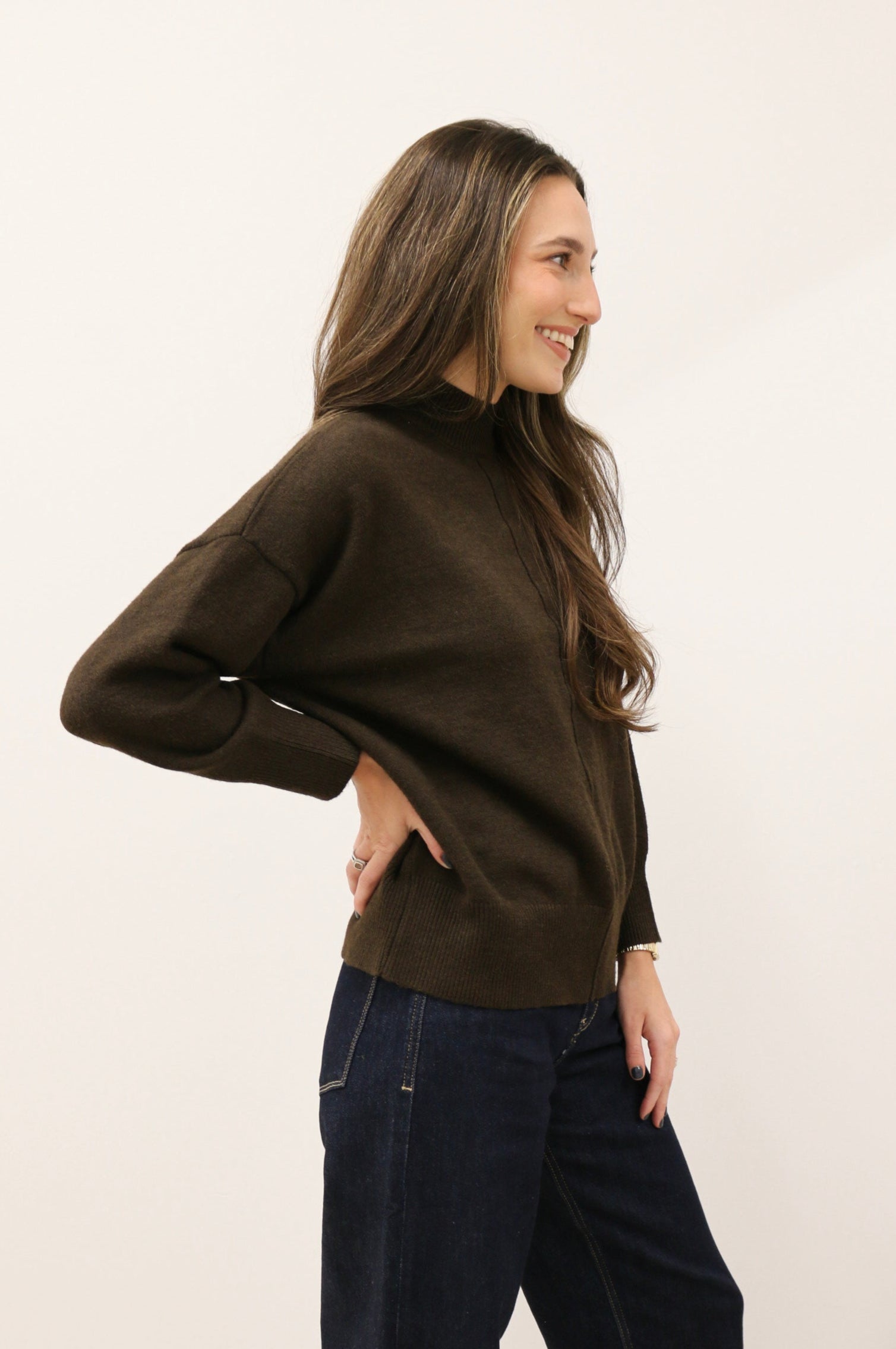 Tilly Front Seam Mock Neck Long Sleeve Relaxed Sweater - Dark Brown